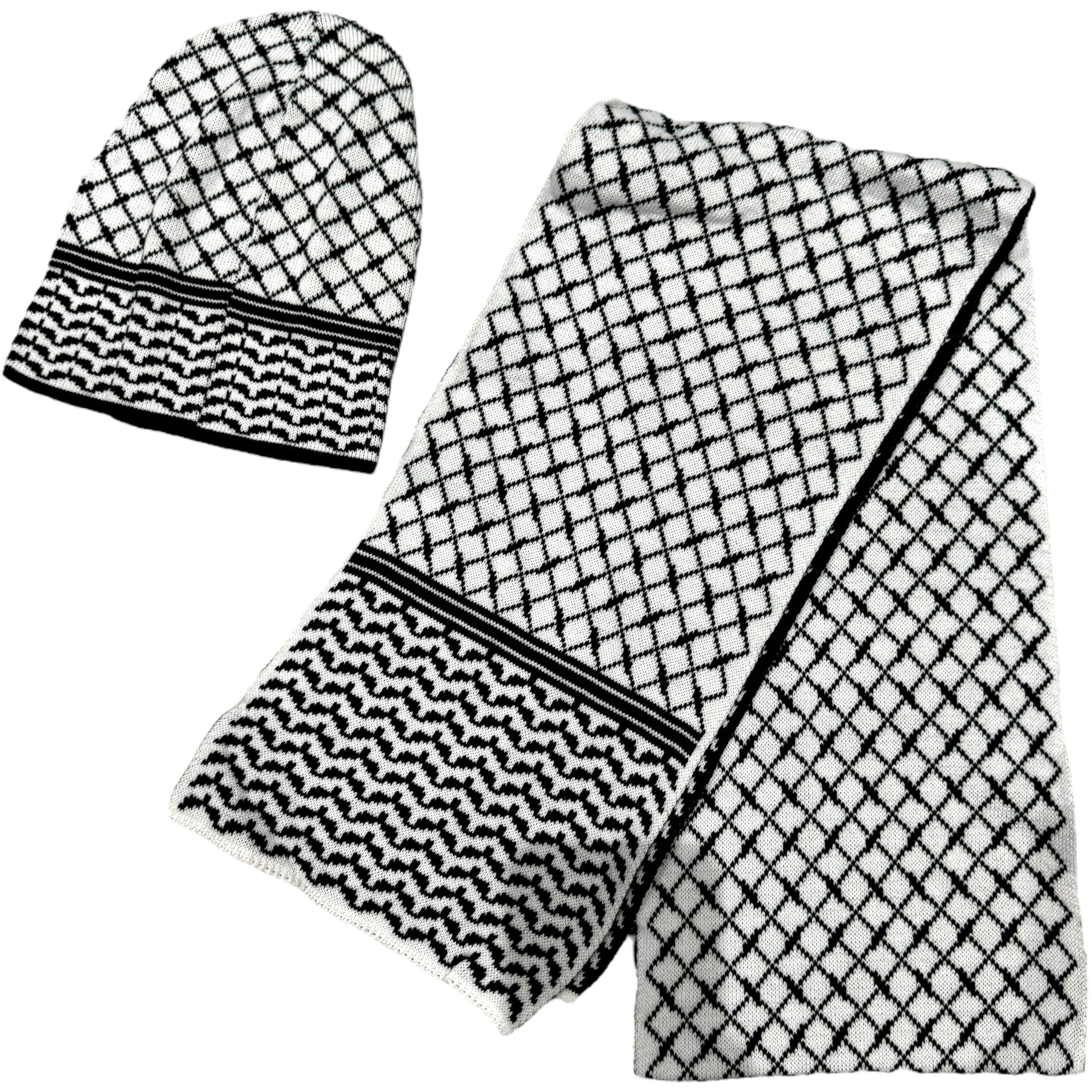 Unisex Black & White Keffiyeh Hat & Scarf Set featuring the iconic shemagh pattern. Soft, warm, and breathable – perfect for winter wear, cultural pride, or as an Islamic gift for Ramadan, Eid, or special occasions.